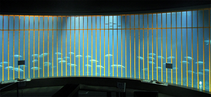 | 2015年7月16日(木) 写真に見えるアクアシアターの左右には、水槽の底が高くなった部分があります。その部分に少し残っていたテープを昨日7月15日、剥がしました。写真は今日7月16日朝のようすですが、閉園後に縦方向のテープを一部剥がす予定です。 |