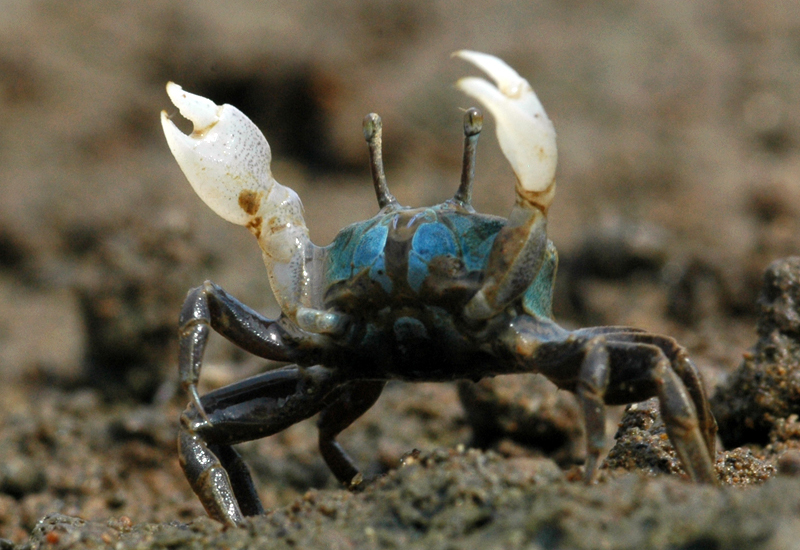 右:ハサミの小さなメスのウェイビングを見つけたらラッキー!