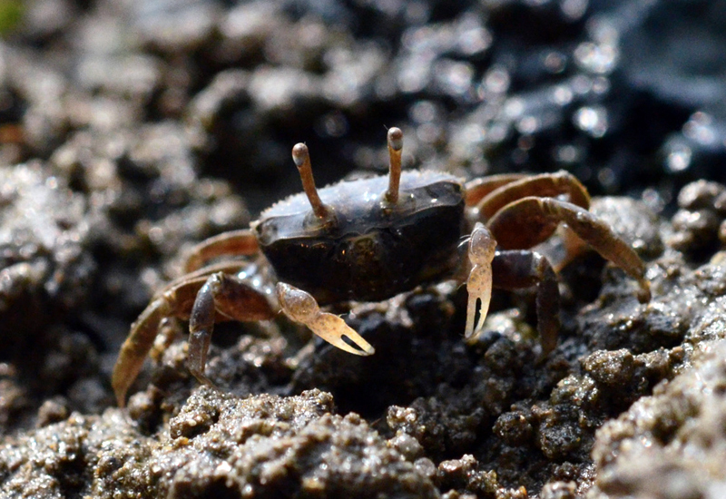 このウェイビングは、繁殖期にオスがメスに対して行う求愛行動とも考えられています。フィールドではあたり一面、数百匹ものチゴガニの白いハサミが、ときには同じタイミングでリズミカルに揺れ動く光景は圧巻です。