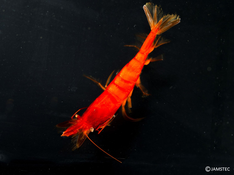 浮上後、プランクトンネットを見てみると、このクルマエビ上科の一種が生きた状態で入っていました。急いで水槽に移して観察すると、船上でもモニターで見たとおりの綺麗な赤色で、しばらくそのまま眺めてしまいました。何とかこのまま生きてほしいと思ったのですが、翌日残念ながら死亡してしまいました。
