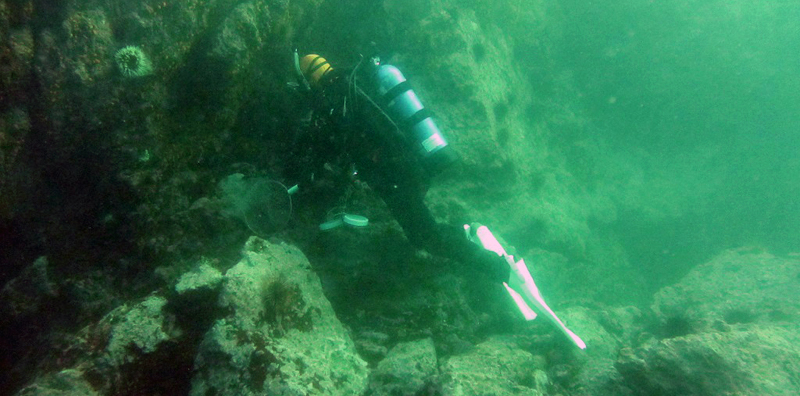 生物は潜水や海岸での引き網によって採集します。潜った海は磯や砂浜の近く、海水は緑色がかっており、冬季は海藻も夏ほど繁茂していません。日が傾いてきたり、昼間でも15メートル以深に潜ったりすると、水中ライトが必要になります。また、同じ場所でも干満差で潮の流れの早くなる時間があるため、いつどこで潜るか、慎重に決めて安全を期します。