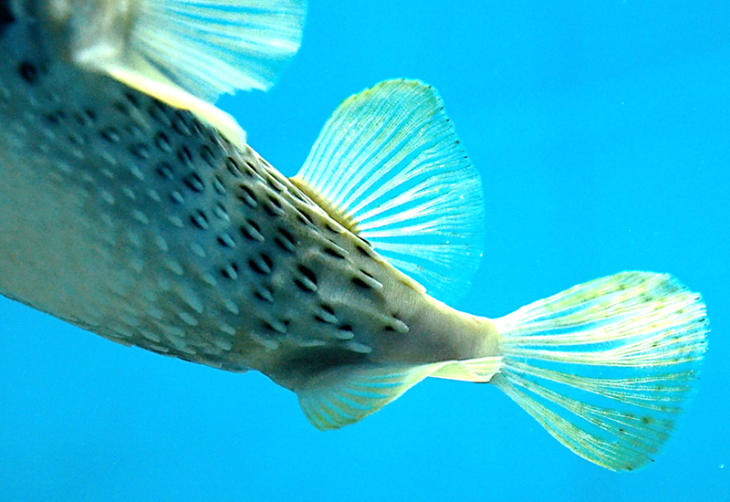 「小笠原(礁)」水槽では、ほっそりとした体型のヒトヅラハリセンボンを見ることができます。膨らんでいない状態のヒトヅラハリセンボンのトゲは身体に沿うように寝た状態です。このトゲは鱗が変形したもので、身体の表面を観察するとどのトゲも尾鰭の方向に向かってきれいに畳まれているようすがわかります。危険を感じずリラックスした状態のヒトヅラハリセンボンをどうぞご覧ください。