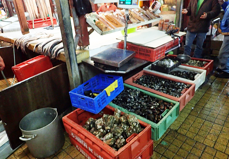 おもにプエルトモンの近くのチロエ島で漁獲されているため、最初にフェリーでチロエ島にわたり、アンクードという町の市場に行きました。しかし、アンクードでは、すでにゆでたピコロコしか売っていないため、再びプエルトモンへ戻り、アンヘルモという町の市場へ行ってようやく生きているピコロコを入手することができました。