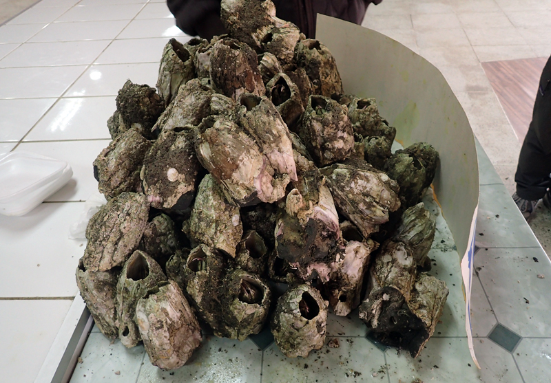 さて、プエルトモンに移動した私たちは、最初に巨大なフジツボのなかま、ピコロコを手に入れるため、市場を訪れることにしました。ピコロコは、チリでは海産物として漁獲され、ゆでたり、スープにしたりして食べられています。