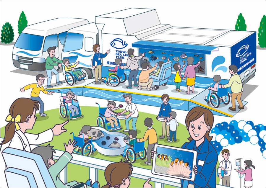 葛西臨海水族園では、生き物や自然の魅力を伝えるための多様な教育プログラムを開発、実施してきました。この活動を園外でも展開し、より多くの方々に向けて生き物や自然の素晴らしさを伝えていくため、移動水族館車(大型水槽を備えた専用トラックと補助車両)で、病気などで普段なかなか水族園に来られない子どもたちのいる施設や都立公園など多くの人が集まる場所を訪問し、生き物の観察やふれあいを通した教育普及活動をおこなう移動水族館事業を始めます。