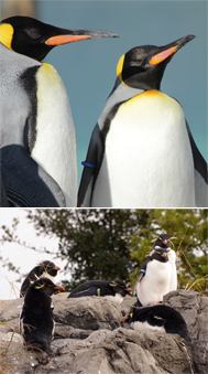 写真:オウサマペンギン(上)とイワトビペンギン(下)
