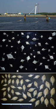 2014年8月26日に水族園前の「西なぎさ」でおこなった地曳網調査では、体長1〜5センチほどの小さな「ギマ」が多く採集されました。