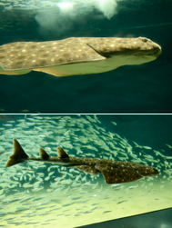 現在この水槽にはコロザメと一緒に、エイのなかまのウシバナトビエイと、サメのなかまアカシュモクザメとツマグロを展示しています。エイやサメたちの鰓あなの位置を見比べるとともに、見た目はエイそっくりなサメのなかま「コロザメ」をぜひじっくり観察してください。