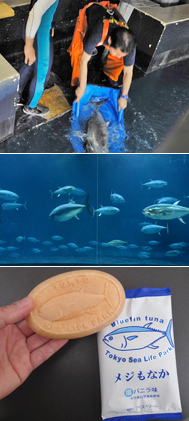 なお、葛西臨海水族園では開園25周年を記念して、今年5月より、レストランシーウィンドで、クロマグロをモチーフにしたオリジナルのもなかアイスクリーム「メジもなか」を販売しています。「メジ」というのは、おもに関東地方でクロマグロの若魚をさす呼び名です。明確なサイズの規定はありませんが、体重20キロ程度までの個体を示すことが多いようです。