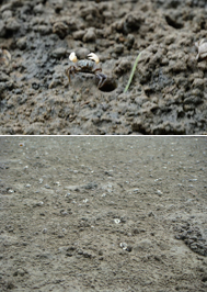 水族園では、干潟の生き物たちが活発になってきた2014年5月末、チゴガニをはじめとした干潟でくらすカニのなかまを採集しました。採集場所は、東京湾に流れ込む河川の河口です。東京湾内には、河口付近に泥や砂が堆積した貴重な干潟が幾つか残っており、チゴガニやアシハラガニなど河口域を代表するカニ類がくらしています。