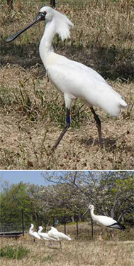 写真下:クロツラヘラサギ(左の3羽)とニホンコウノトリ(右)