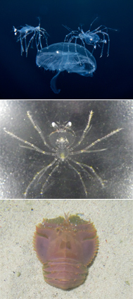 写真上:クラゲ(中央)とウチワエビの幼生「ジェリーフィッシュライダー」(2014年2月17日撮影)