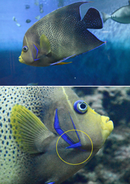 今回ご紹介するサザナミヤッコにも左右のえらぶたの下側に後ろ向きの鋭いとげが一本ずつあります。このとげを使ってどうやって身を守ると思いますか。