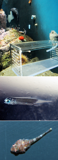 2012年に水族園ではこの魚の繁殖にチャレンジしました。当初、水槽で孵化した仔魚を回収しようとしましたがうまくいかず、効率よく仔魚を回収するために色々と工夫をして、元気な仔魚を得ることができました。