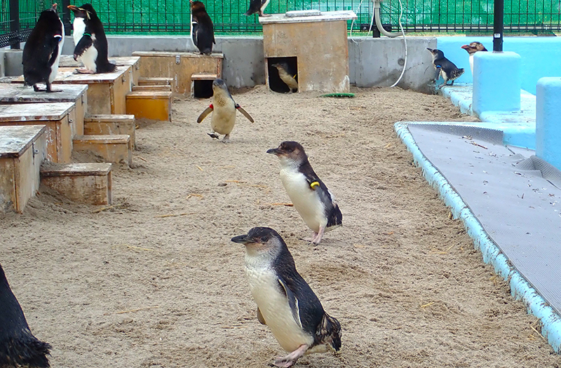 仮設飼育施設では、フンボルトペンギン、オウサマペンギン、フェアリーペンギン、まだ繁殖に関わらない若いミナミイワトビペンギンを合わせて約70羽飼育しています。この施設は、「ペンギンの生態」エリアのような岩場の多い飼育環境とは異なり、陸地の全面に砂を敷いています。移動当初はおぼつかない足取りだったペンギンたちですが、現在は慣れてきたようでしっかり砂を踏みしめて歩き、巣穴を作るために砂を掘ったり、腹這いで寝そべったりしている姿をよく見かけるようになりました。
