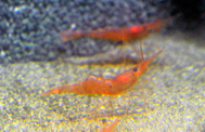 タラバエビ科に属し、以前展示していたモロトゲアカエビもこのなかまです。このなかまは、まずオスになって成熟し、その後すべてメスに性転換します。性転換は5歳ころに起こり、寿命は10年以上とされています。外形の特徴は、全身がとてもきれいな赤色で、少し透けて内臓が見えることです。