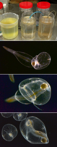 そこで試しに、展示水槽で採れた卵から孵化した小さな仔魚を与えてみました。小さな仔魚といっても、体の長さは1.5ミリほどあります。直径が0.5〜1ミリしかないヤコウチュウが食べるには、大きすぎるかと思いましたが、顕微鏡をのぞいて見えてきた光景は驚きでした。