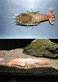 このエビの形態には大きな特徴がいくつかあります。1つめは体の形です。体長十数センチメートルの体は、全体的にペタンコで、一見して只者(タダエビ?)ではないことが分かります。水槽内ではたいてい砂に潜っていて、掘り出しても、すぐに後ろの脚でもぞもぞと砂を掘り潜ってしまいます。隠れたがりのセンジュエビにはぴったりの形なのでしょう。