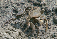 干潟の上で食事をしていた大きめのヤマトオサガニを撮影していたところ、小さなヤマトオサガニが近づいてきました。ヤマトオサガニのおもな餌は干潟の表面に生える微小な藻類といわれていて、ハサミ脚で干潟表面の泥をちょっとずつ口に運びます。