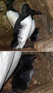 その後有精卵と判明したので、当園の仮親に預けて育てていたところ、7月8日に孵りました。ウミガラスは巣穴をつくらず岩の上に産卵します。現在展示場に向かって中央の岩の奥でひなを育てていますが、その姿は観覧側からは見えません。