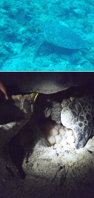 小笠原はアオウミガメの日本最大の繁殖地で、まさに今繁殖期を迎えています。幸運にも、滞在中に産卵の瞬間に立ち会うことができました。物音をたてたり懐中電灯で照らしたりすると、上陸したカメが驚いて産卵せずに海へ帰ってしまうこともあります。観察は、アオウミガメの調査・保護活動をおこなっている「小笠原海洋センター」の職員の方に案内していただきました。