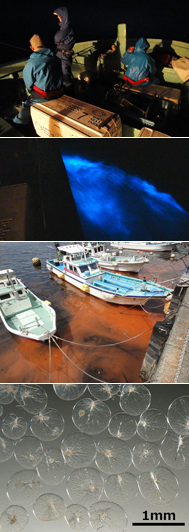 葛西臨海水族園では「深海の生物」コーナーの展示を充実させるため、2011年5月7日、静岡県沼津市戸田港の深海底引き網漁船に乗せていただき、ミドリフサアンコウなどの深海生物の採集をおこないました。この採集のようすは別の機会に紹介させていただくとして、今回は、漁場に向かう途中と採集を終えて帰港後に見られた、幻想的な光景をご紹介します。