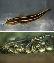 ゴンズイはナマズのなかまです。8本の口ひげと、褐色のからだに4本(片側2本ずつ)の黄色い線が頭から尾にかけて走っているのが特徴です。大きくなると体長30センチメートルほどになり、黄色い線は不明瞭になる場合もあります。