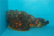 葛西臨海水族園世界の海「モーリシャス」の水槽では、2匹のオニダルマオコゼを展示しています。体表には、水槽の中の岩と同じコケが付着し、ふだん見慣れている私たちでも遠くからでは、岩との区別に迷うことがあります。また、この魚はときどき体表をきれいにするためか、魚のなかまでは珍しく「脱皮」をすることがあり、ちぎれた古い表皮が水槽の中を漂っていることがあります。