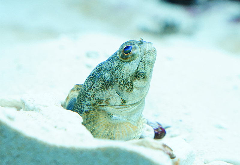 ダーウィンジョーフィッシュは、砂に穴を掘り、サンゴ礫や貝がらを積み上げて巣穴を作ります。ふだんは巣穴に隠れていることが多く、一見どこにいるかわかりにくいですが、壁沿いや岩組の下などをよく見ると、顔を出してきょろきょろと大きな眼でまわりのようすをうかがっている姿が見られます。