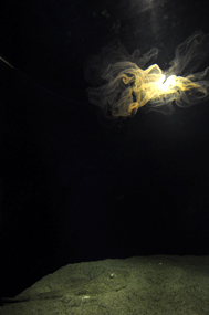 でも、せっかく産んだので、卵を写真で紹介します。グースフィッシュは、たくさんの卵が透明のゼラチン質につつまれた、卵帯(らんたい)とよばれる帯状のかたまりを産みます。写真を見てください。右上に写っているモヤモヤした物体が卵帯です。今回産み出された卵帯の長さはなんと8.7メートル、重さは5.4キログラムもありました。その中には、直径 1.7ミリほどの卵が、およそ35万個含まれていました。卵帯は水面に漂います。たくさんの卵に光があたって輝くようすは、夜空に光るオーロラのようで、とても幻想的でした。
