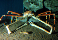 オスは成長すると、広げたハサミ脚が4メートルに達するものもいるタカアシガニ、世界最大の甲殻類です。岩手県から九州までの太平洋岸、台湾東方沖の東シナ海に分布し、ふだんは水深150~800メートルに生息しており、春の産卵期には、30メートルほどの浅場までやってきて産卵するといわれています。その「世界最大のカニ・タカアシガニ」が深海コーナー4番目の水槽にやってきました!