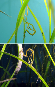 展示している場所は、葛西臨海水族園「東京の海」エリアの2階中央付近にある「アマモ場の小さな生き物たち」小水槽です。水槽の前に立って、この隠れ上手な生き物を探してみましょう。体の後半にある「歩脚」とよばれる脚でしっかりアマモの葉にしがみつき、体の前方の「顎脚」でぴったり葉にくっついているので、動かずじっとしていると、どこにいるのかほとんどわかりません。