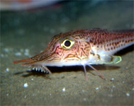そのひとつが「キホウボウ」。とても変わったかたちをしていて、長く伸びた2本の口先をもち、その根元には口ひげのようなものが生えています。さらに、胸びれのそばにある足のようなひれすじを使って動いているようすは、まるで「歩いて」いるかのようです。