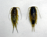 2種の見分け方は、第2触角と尾肢(びし)の長さがポイントとなります。第2触角とは頭から長く伸びる「むち状」のもので、尾肢とは第2触角とは逆に、体の一番うしろから伸びている器官です。キタフナムシはフナムシよりも第2触角と尾肢が短いため、並べて見比べると区別ができます。