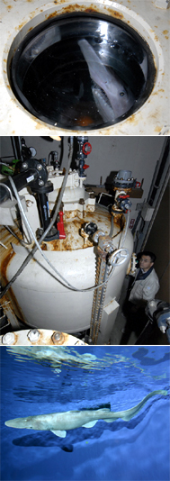 写真上:加圧水槽内のミツクリザメ
