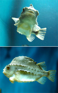 水槽の中を泳いでいるランプサッカーのお腹の方をよく見ると、ちょっと変わったことに気がつくでしょう。何か丸い円盤のようなものが見えますが、じつこれはランプサッカーの腹びれなのです。吸盤のような作りになっていて、岩や水槽の壁面、アクリルガラスに張りつくことができます。