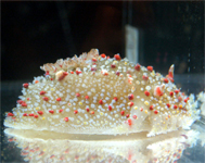 葛西臨海水族園では、東京の海エリアにある「10min 実験展示コーナー」のトピック水槽で「ハナデンシャ」の展示を始めました。ハナデンシャは、体長最大約15センチになる大型のウミウシの一種です。半透明の体に、朱色や黄色、白色の大小多数の突起物があり、とてもカラフルな色をしています(写真)。