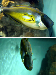 体の表面は「つるり」とした質感で、本当に革ジャンを着ているように見えます。そして黄色や青色をとりまぜた体色をしており、なかなか美しい魚だと私は思います。