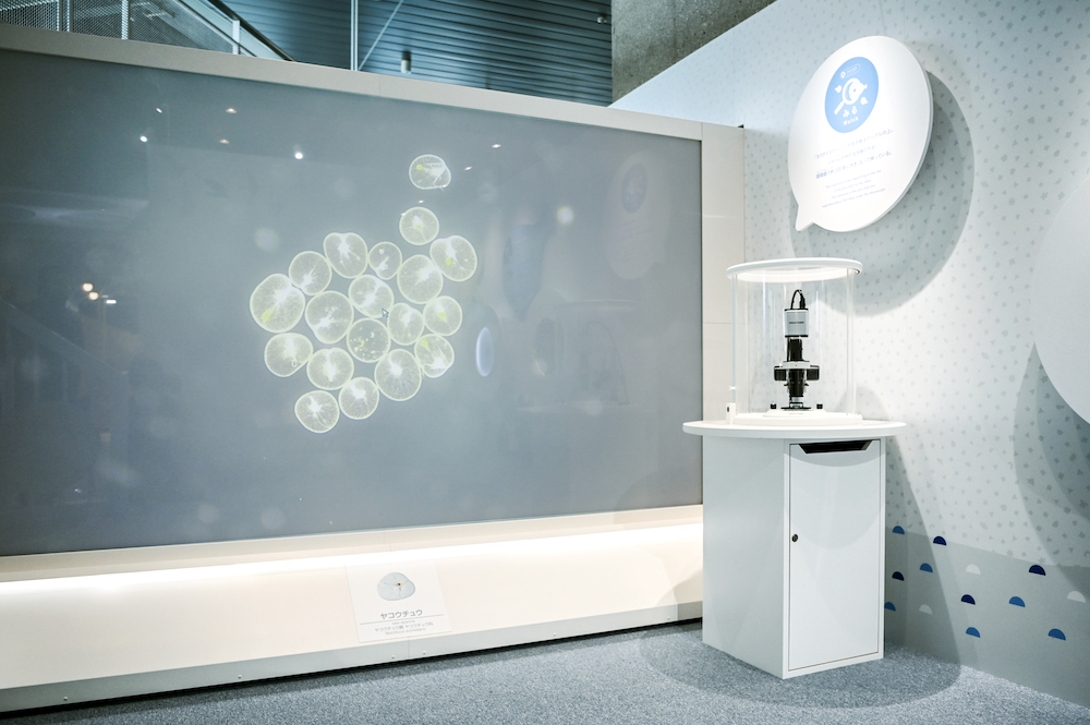 ミクロノマヂカ内にあるひときわ大きなモニターでは、水族園でえさとしても使用されている甲殻類のなかまのブラインシュリンプや、夏の夜に海の浜辺などで光るようすを見ることができる小さなプランクトンのヤコウチュウといった、実際に生きているミクロな生き物をその場で顕微鏡を使って、拡大して映し出しています。