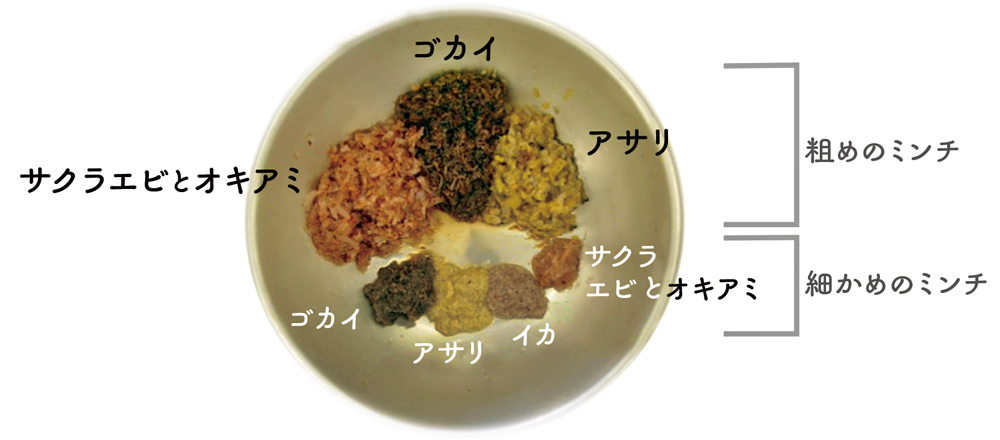 ミンチにしたえさ各種。魚の口の大きさ合わせて用意する