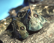 荒波がくだけちり、つねに波しぶきがかかるような岩の上がタマカエルウオの生活場所です。こうした場所は外敵も少なく、競争者もあまりいません。でも、そのかわりに温度の変化が激しい過酷な環境です。荒波にさらわれない工夫や、乾燥に耐える工夫も必要です。タマカエルウオの体は粘液におおわれ、乾燥しにくくなっており、また皮膚呼吸をすることもできます。