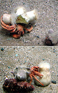 2匹は接近し、緊張した雰囲気……。ダイは、前日死んだ別のヤドカリの殻からひきはがしてきたイソギンチャクを、自分の貝殻につけようと悪戦苦闘しているところでした(写真上)。しかし、背中にスペースがないためか、うまくいきません。それを、近くでものほしげ(?)に眺めるショウ。