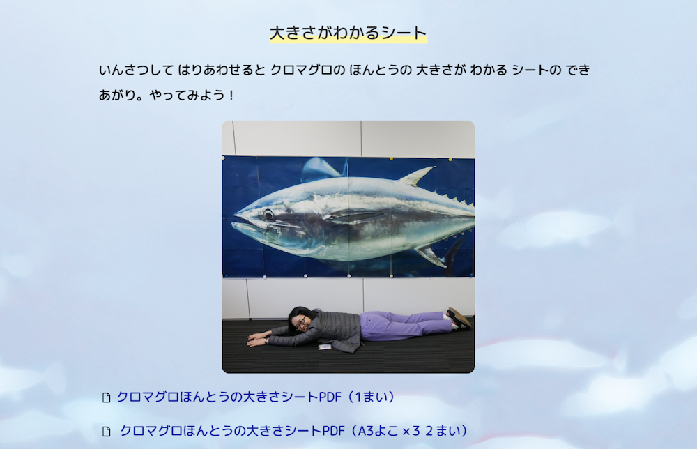 お話に登場するマグロについて、クロマグロを例に写真や動画で紹介します。印刷して貼り合わせればクロマグロの大きさを実感できる「ほんとうの大きさ」シートをダウンロードできます。