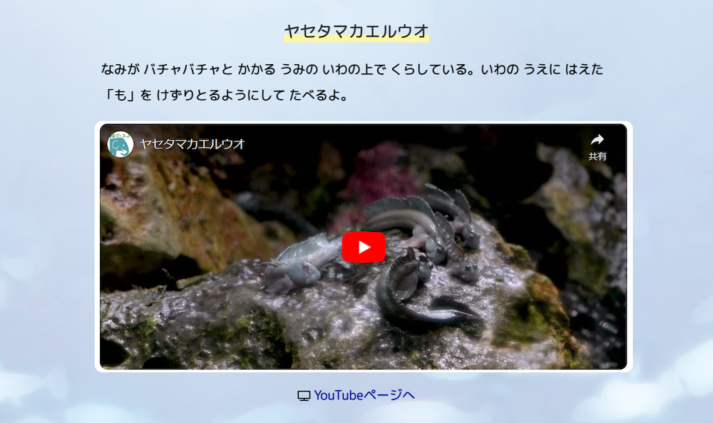 「スイミー」に登場するさまざまな生き物の参考画像や動画、実寸大シートの他、比喩的な表現の学習に使えるユニークな生き物の動画集など、国語の学習に役立つだけでなく、「スイミー」のくらす海の世界を楽しめる内容です。水族園ご来園の際に役立つ「スイミーのなかまにあいにいこうマップ」や教員向けの説明書なども掲載しましたので、ぜひご活用ください。