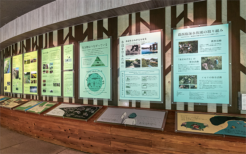 開発の影響などで減った水辺の環境とその大切さを紹介する情報パネルの展示です。水族園でおこなっている保全活動も紹介しています。