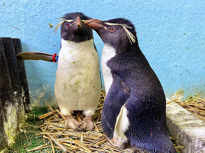 野生のミナミイワトビペンギンのオスとメスは、繁殖期以外は別々の海域で生活しています。繁殖期になるとオスがまず陸地に上がり、メスを迎え入れるための巣を準備をします。そしてその数日後、メスが合流して繁殖が始まります。