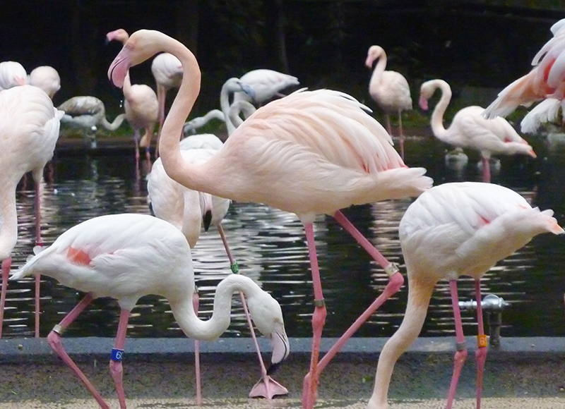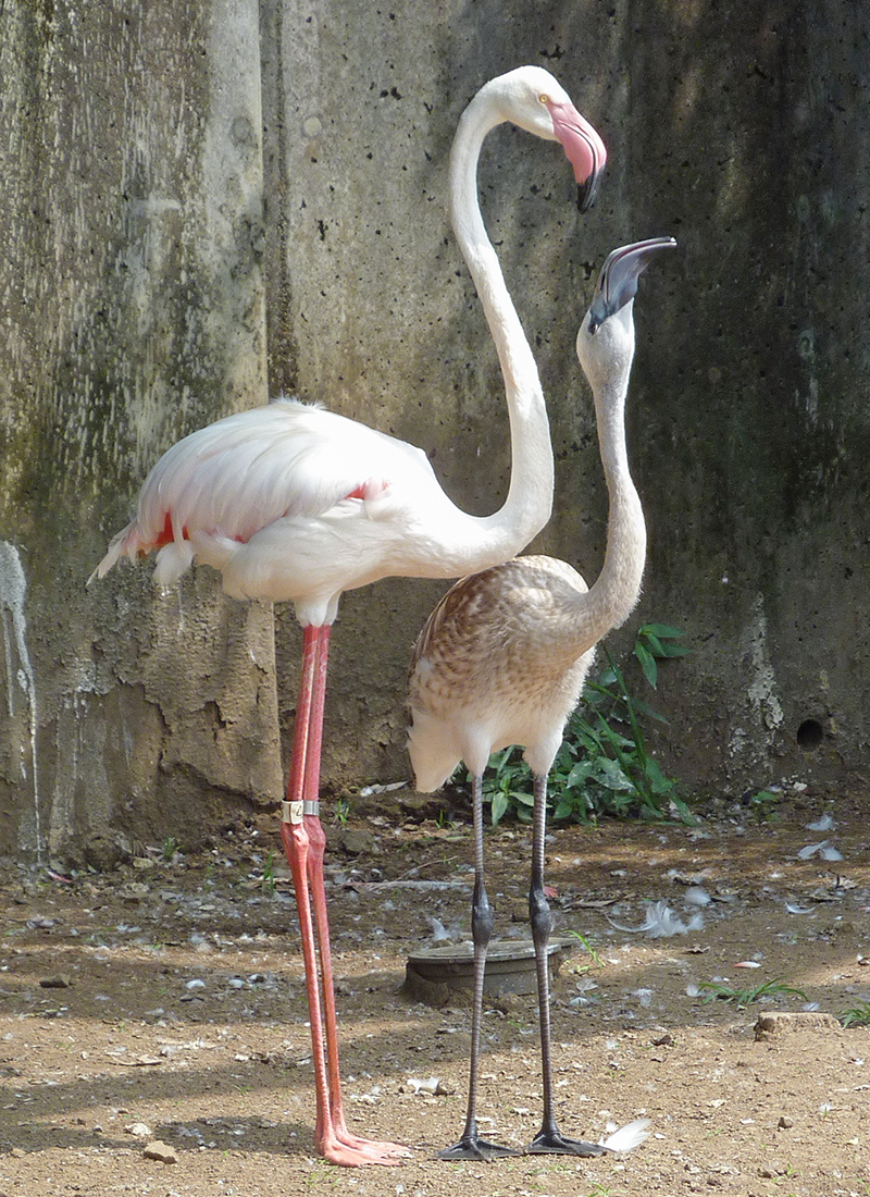この時期になるとフラミンゴは次の繁殖に向けた準備を始めます。賑やかに鳴き交わしながら、体の色が濃いピンク色になったヨーロッパフラミンゴたちが、首を左右に振っている姿が見られるかと思います。よく見ると嘴だけ灰色のものや、全身灰色のフラミンゴも紛れていることがあります。多摩動物公園で昨年から今年にかけて生まれた若いフラミンゴについてお伝えします。