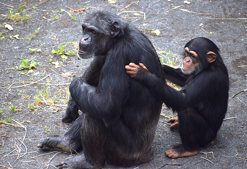ずる賢い一面がある一方で、チンパンジーの子どもたちは共感力の塊でもあります。大人がケンカに負けて泣いているときや、挨拶をしたのに相手に応えてもらえなかったときには、そっと駆け寄り、大人を抱きしめて落ち着かせます。