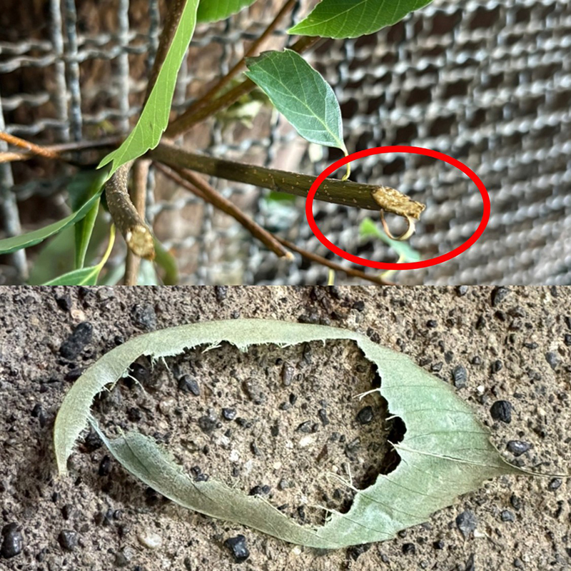 切り口が斜めの枝(赤丸部分)と真ん中だけ食べられた葉