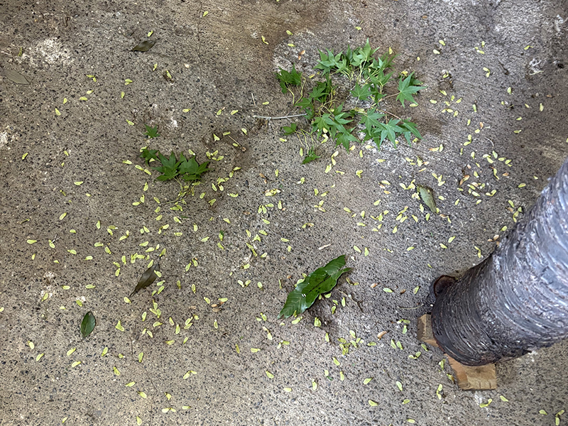 モミジは葉ではなく種子を食べます。モミジの果実はプロペラのような形をしており、食べるのは根元にある種子だけなので、ほかの部分は残して落とします。種子の大きさは1.5cmほどの小ささのため、たくさん食べればその分殻の量も増えるので掃除が大変です。サイズの小さい種子をたくさん食べて本当にお腹いっぱいになっているのかな?と思うこともあります。